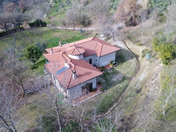La villa, in posizione panoramica con esposizione a sud-ovest, è realizzata secondo criteri antisismici con blocchi portanti di laterizio termico poroton e cappotto termico interno oltre a tetto ventilato su parte abitativa con legno lamellare. A 5 km circa dal centro ed a 6 km circa dalla stazione ferroviaria.